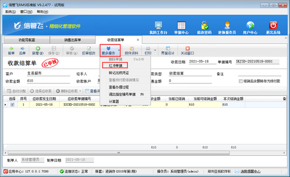 收款結算單打開后,關閉“應收應付及結銷情況”窗口,在收款結算單界面工具欄“更多操作”下選擇“紅沖單據”,紅沖收款結算單,收款結算單紅沖后,銷售出庫單應收款結銷狀態更新為“未結銷”,然后即可反審修改銷售出庫單,如下圖所示: