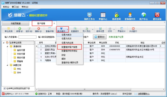在功能導航窗點擊“基礎資料”—》“客戶信息”,在客戶信息界面工具欄點擊“更多操作”下的“批量維護客戶信息”,如下圖所示: