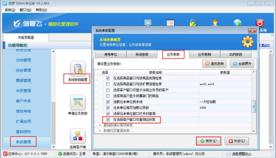 在功能導航窗點擊“系統管理”—》“系統參數配置”,在“業務參數”中可勾選參數“在選擇客戶窗口可查詢應收款”,然后保存參數,如下圖所示: