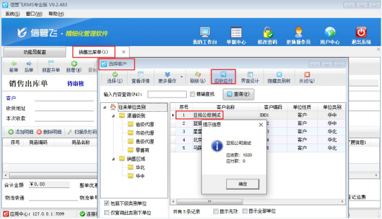 參數保存完成后,在銷售管理中新開銷售出庫單,選擇客戶界面可查詢當前客戶的應收款情況,如下圖所示: