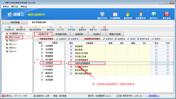 在功能導(dǎo)航窗點(diǎn)擊“系統(tǒng)管理”—》“操作員及授權(quán)”,進(jìn)入“操作員管理及授權(quán)”界面,選擇操作員“張亞”,在其右側(cè)的功能模塊權(quán)限內(nèi)選擇“出納查詢”模塊,將出納憑證明細(xì)查詢的“使用”權(quán)限勾選取消,然后保存設(shè)置,如下圖所示: