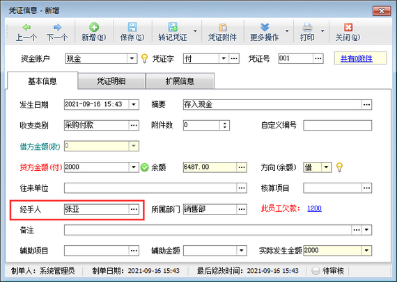 在功能導航窗點擊“出納管理”—》“現金日記賬”,新增日記賬憑證時選擇一下經手人信息,如下圖所示。