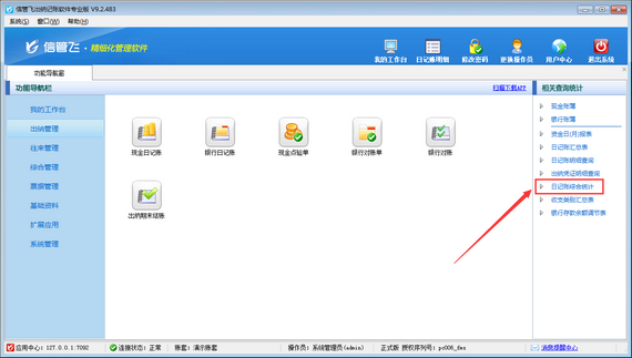 然后在“出納管理”模塊最右側的“相關查詢統計”內點擊“日記賬綜合統計”,打開“日記賬綜合統計”界面,如下圖所示。