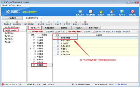 登錄軟件,在功能導航窗點擊“系統管理”—》“操作員及授權”,進入“操作員管理及授權”界面,選擇操作員“張亞”,在其右側的功能模塊權限內選擇“系統管理”模塊,將系統參數配置的“使用”權限勾選取消,然后保存設置,如下圖所示。