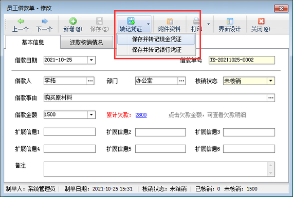 在員工借款管理界面工具欄點(diǎn)擊“新增借款單”,打開新增借款單界面可以錄入借款信息,借款信息填寫完成后保存借款單,借款單保存后,新增借款單界面工具欄點(diǎn)擊“轉(zhuǎn)記憑證”即可轉(zhuǎn)記現(xiàn)金及銀行憑證。