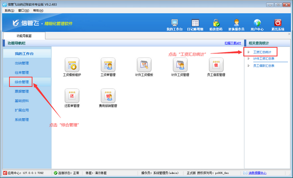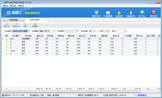 在功能導航窗點擊“綜合管理”—》“工資匯總統計”即可進入工資匯總統計表界面,如下圖所示。