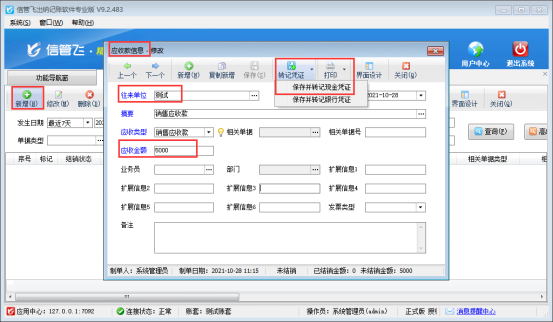 功能導航窗“往來管理”—》“應收款管理”中,新增一筆客戶“測試”的應收款記錄,應收金額5000元,保存并轉記現金憑證,如下圖所示: