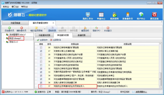 信管飛RMS軟件支持客戶和供應商設置所屬業務員,來管理業務員的業績情況。在開單選擇客戶后自動顯示默認的業務員和經手人,為了避免操作員開單選擇客戶或供應商后修改對應的業務員或經手人信息,軟件支持控制操作員不能修改業務員和經手人權限,本文以“信管飛RMS軟件”為例進行示范。