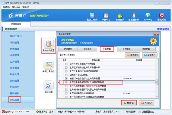 在功能導航窗點擊“系統管理”—》“系統參數配置”—》“業務參數”打開業務參數配置界面,在生產管理相關參數中打鉤啟用“生產任務單數量不可大于銷售訂單數量”參數,如下圖所示。