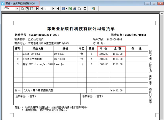 新增一個送貨單,保存單據后預覽默認模板顯示單價和金額,如下圖所示: