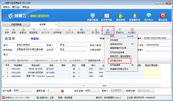 信管飛RMS軟件信管飛送貨單軟件等支持打印銷售單,內置打印模板默認顯示單價和金額信息,有用戶需要開單界面顯示出單價和金額信息,在打印時不需要顯示出單價和金額信息,這種應該如何設置?本文以“信管飛送貨單軟件”為例示范下。
