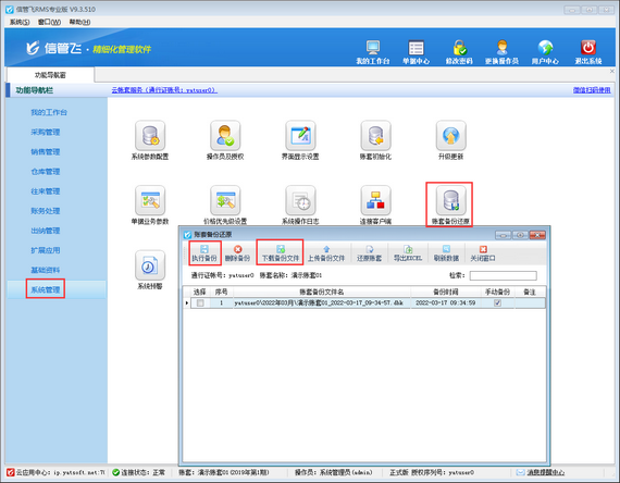 登錄已有賬套,然后在功能導航窗中點擊“系統管理”—》“賬套備份還原”,在打開的“賬套備份還原”窗口,執行備份并將備份文件下載到本地存儲,如下圖所示。