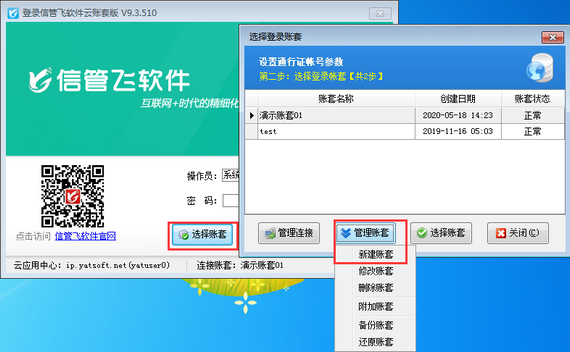 在云賬套登錄界面,點擊“選擇賬套”,打開“選擇登錄賬套”界面,點擊“管理賬套”—》“新建賬套”,新建一個空賬套,并選擇新建的賬套進行登錄。