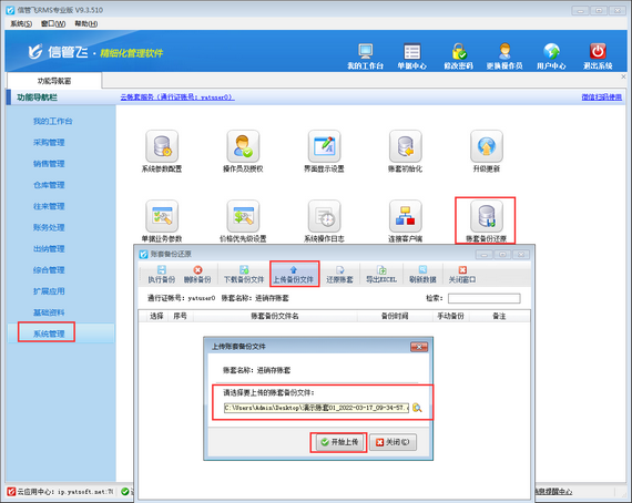 新建的賬套登錄后,同樣在功能導航窗中點擊“系統管理”—》“賬套備份還原”,在打開的“賬套備份還原”窗口,上傳備份文件并還原賬套,如下圖所示。