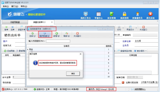 軟件默認操作員沒有勾選“數據字典維護”權限,使用此操作員登錄,在新開單據界面。打開“結算方式”,點擊“維護”,會提示“您沒有數據字典維護權限,請與系統管理員聯系!”如下圖所示: