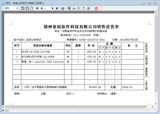 新開送貨單確認保存,默認打印模板預覽界面如下圖: