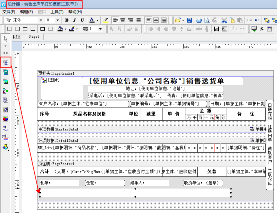 需要添加備注內容,在送貨單開單界面點擊“打印”下的“打印格式設計”,選擇模板點擊“設計格式”,進入模板設計器界面,模板設計界面選擇左邊工具欄“插入文本框”,然后放置到頁尾處,文本框寬度可根據輸入的內容進行調整,如下圖所示: