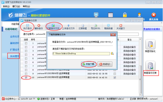 云賬套版本數(shù)據(jù)默認存儲在云服務器上,需要換到本地版使用,在云賬號即將到期時打開“系統(tǒng)管理”—》“賬套備份還原”,在賬套備份還原界面點擊“執(zhí)行備份”,執(zhí)行備份完成,選擇下備份文件,點擊“下載備份文件”到選擇的存放目錄中,隨后點擊“開始下載”,完成后則云賬套數(shù)據(jù)備份下載到本地存放目錄中,如下圖所示: