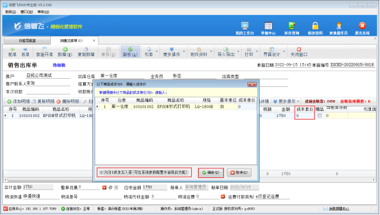 設(shè)置完成后,在功能導(dǎo)航窗點(diǎn)擊“銷(xiāo)售管理”—》“銷(xiāo)售出庫(kù)單”,新開(kāi)銷(xiāo)售出庫(kù)單,此時(shí)如果商品的成本單價(jià)為0,審核單據(jù)時(shí)會(huì)出現(xiàn)“以下商品成本價(jià)為0,請(qǐng)輸入成本價(jià)”的提示信息,這時(shí)需要勾選左下方允許0成本出入庫(kù),之后點(diǎn)擊“確定”,單據(jù)可審核成功,如下圖所示: