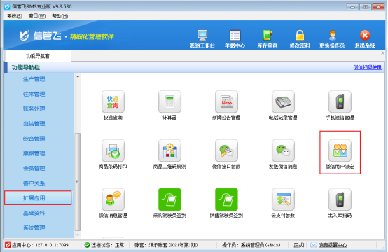 在功能導航窗點擊“擴展應用”—》“微信用戶綁定”,可進入“微信用戶綁定管理”界面,選中已綁定的微信客戶,在“綁定操作”下取消綁定,即取消對客戶的綁定如圖所示。
