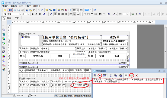在模板設(shè)計(jì)器中,新增一個(gè)文本框(新增文本框在左側(cè)工具欄添加),打開新建文本框然后輸入名稱:累計(jì)欠款,調(diào)用數(shù)據(jù)項(xiàng)“[[單據(jù)主體."本單前應(yīng)收款"] + [單據(jù)主體."應(yīng)收應(yīng)付金額"]-[單據(jù)主體."本次收款金額"]]”,點(diǎn)擊“√”確定保存,如下圖所示:
