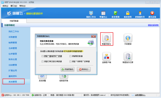 默認(rèn)初始化會(huì)刪除所有的數(shù)據(jù)(包括基礎(chǔ)資料和業(yè)務(wù)單據(jù)),我們可以根據(jù)自己的實(shí)際需要去選擇需要保留和刪除的內(nèi)容,可打勾選擇要保留的數(shù)據(jù)內(nèi)容。點(diǎn)“開始初始化”等待軟件執(zhí)行完成即可,如下圖所示: