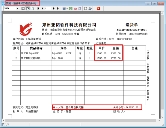新開一個銷售出庫單,打印下點擊打印預覽,默認模板“送貨單打印模版(B01)”預覽界面如下所示,含單價和金額。