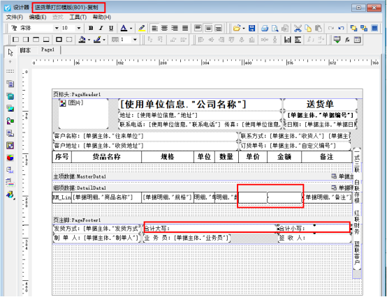 用戶需要打印一份一樣的無價格的模板,在銷售出庫單界面點擊打印下的“打印格式設計”,在打印格式設計界面,點擊“送貨單打印模板(B01)”,工具欄點擊“復制”,會生成一個“送貨單打印模版(B01)-復制”的模板,選擇此模板點擊“設計格式”,設計器界面刪除單價金額對應的明細列調用數據項,保存模板預覽可看到單價金額處為空顯示。如下圖所示: