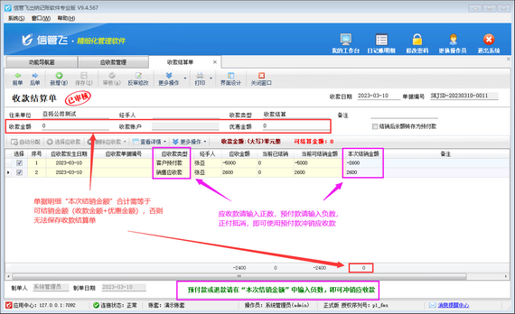 在應(yīng)收款管理界面工具欄點(diǎn)擊“收款結(jié)算”按鈕,可以打開收款結(jié)算單對(duì)客戶預(yù)付款/銷售應(yīng)收款進(jìn)行收款結(jié)銷。如下圖所示,客戶“亞拓公司測(cè)試”應(yīng)收金額2600元,客戶預(yù)付款5000元,在單據(jù)明細(xì)“本次結(jié)銷金額”中,銷售應(yīng)收款輸入2600,客戶預(yù)付款輸入-2600,正負(fù)抵消,即可使用客戶預(yù)付款沖銷銷售應(yīng)收款。