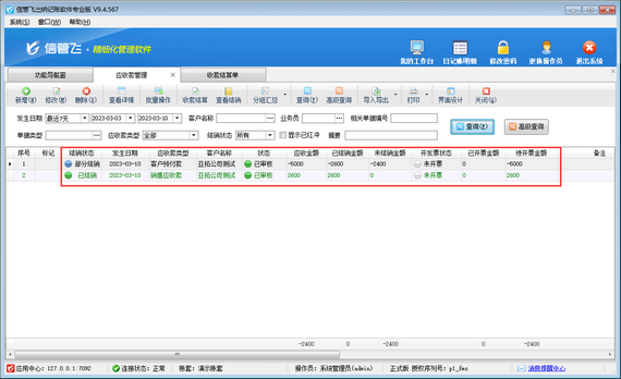 收款結(jié)算單單據(jù)審核之后,會(huì)更新銷售應(yīng)收款及客戶預(yù)付款的結(jié)銷狀態(tài),在應(yīng)收款管理界面可以查看結(jié)銷情況,如下圖所示,剛新增的銷售應(yīng)收款記錄已更新為“已結(jié)銷”,未結(jié)銷金額為0;剛新增的客戶預(yù)付款記錄更新為“部分結(jié)銷”狀態(tài),未結(jié)銷金額還有-2400元,后續(xù)還可以用于沖銷銷售應(yīng)收款。