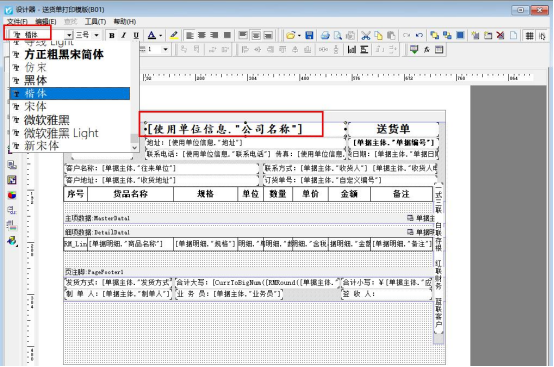 需要修改使用單位名稱為“楷體”顯示,該如何設(shè)置?以“送貨單軟件”為例,送貨單開單界面打印下選擇“打印格式設(shè)計”,在打印格式設(shè)計界面,選擇模板點(diǎn)擊“設(shè)計格式”,進(jìn)入模板設(shè)計器界面,選擇“使用單位—公司名稱”文本框,右上角字體由“黑體”修改為“楷體”,如圖所示: