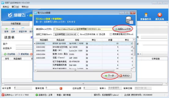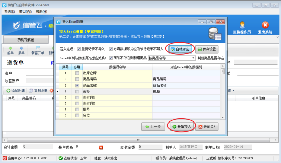 在功能導(dǎo)航欄業(yè)務(wù)處理--新開送貨單,點(diǎn)擊新開送貨單進(jìn)入開單界面,工具欄“導(dǎo)入導(dǎo)出”按鈕下拉列表選擇“從EXCEL導(dǎo)入明細(xì)”,第一步:選擇要導(dǎo)入的excel文件點(diǎn)擊下一步,第二步:設(shè)置數(shù)據(jù)項與excel數(shù)據(jù)列的對應(yīng)關(guān)系,點(diǎn)擊自動對應(yīng),沒有自動對應(yīng)請手動設(shè)置對應(yīng)關(guān)系,點(diǎn)擊開始導(dǎo)入,如圖所示: