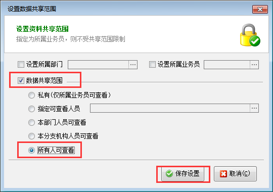 在設置數據共享范圍窗口,勾選“數據共享范圍”然后選擇需要設置的共享范圍,點擊“保存設置”按鈕保存設置即可,如下圖所示,設置數據共享范圍為“所有人可查看”。
