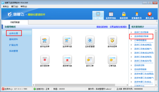信管飛送貨單軟件,功能導(dǎo)航窗點(diǎn)擊“業(yè)務(wù)處理”,右側(cè)查詢統(tǒng)計(jì)下點(diǎn)擊“送貨明細(xì)對(duì)賬單”,可匯總客戶已開送貨單的商品明細(xì)內(nèi)容,如下圖所示: