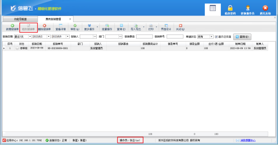 權(quán)限設(shè)置完成后,使用操作員“張亞”登錄軟件,打開費(fèi)用報(bào)銷管理界面,可以看到工具欄“修改”按鈕為灰色的,操作員無法修改費(fèi)用報(bào)銷單。如圖所示: