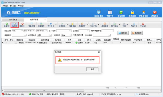 有用戶在修改應收款時,會遇到無法修改的情況,系統彈出提示信息“當前記錄為其它操作員錄入的,您沒有權限修改!”,如下圖所示。