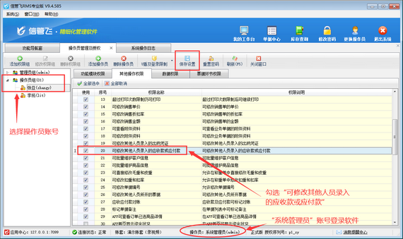 出現此問題的原因是,當前登錄的操作員賬號沒有修改其他人員錄入的應收應付款權限,解決方法如下:使用系統管理員賬號登錄軟件,在功能導航窗點擊“系統管理”—“操作員及授權”打開操作員管理及授權界面,選擇操作員賬號,在“其他操作權限”界面將“可修改其他人員錄入的應收款或應付款”權限勾選上,然后保存權限設置,如下圖所示。