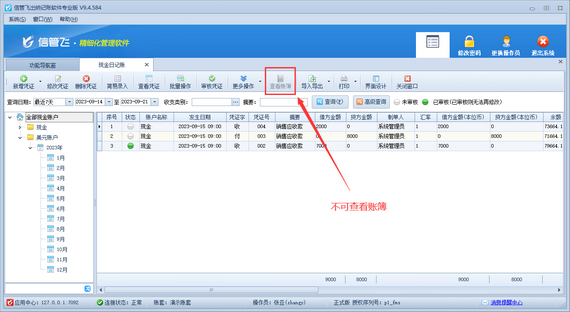 信管飛出納記賬軟件內(nèi)包含豐富的記賬統(tǒng)計表格,如現(xiàn)金賬簿、銀行賬簿、資金日(月)報表、收支類別匯總表等。有用戶在使用軟件時無法查看出納賬簿,如下圖所示。