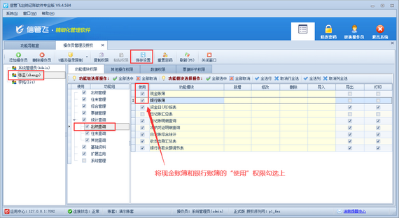 出現(xiàn)此問題的原因是:當前登錄的操作員賬號沒有“現(xiàn)金賬簿”和“銀行賬簿”的查看權限,解決方法如下:使用系統(tǒng)管理員賬號登錄軟件,在功能導航窗點擊“系統(tǒng)管理”—》“操作員及授權”打開操作員管理及授權界面,選擇操作員賬號,在其右側的功能模塊權限內(nèi)選擇“出納查詢”,將“現(xiàn)金賬簿”和“銀行賬簿”的“使用”權限勾選上,然后保存權限設置,如下圖所示。