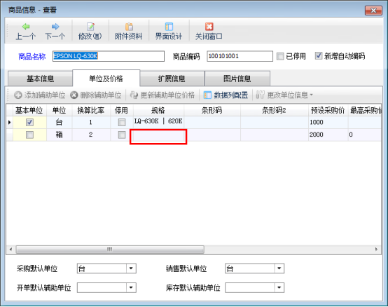功能導(dǎo)航窗點(diǎn)擊“基礎(chǔ)資料”—“商品信息”點(diǎn)擊修改按鈕,在單位及價(jià)格界面進(jìn)行添加輔助單位,輔助單位規(guī)格默認(rèn)為空顯示,如下圖所示: