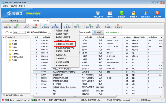 在商品信息界面,點(diǎn)擊工具欄“更多操作”下的“批量維護(hù)輔助單位信息”,可進(jìn)入批量維護(hù)輔助單位界面。如下圖所示: