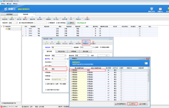 信管飛RMS、信管飛倉庫管理軟件等可以在軟件使用前維護(hù)好商品信息,方便開單直接選擇,有客戶存在商品信息除單位、商品編碼、規(guī)格外還有其他固定的商品屬性,軟件的商品信息維護(hù)界面支持?jǐn)U展信息,可以把其他固定的商品屬性內(nèi)容輸入在擴(kuò)展信息中,如下圖所示,自定義“商品擴(kuò)展信息1”為商品“顏色”。