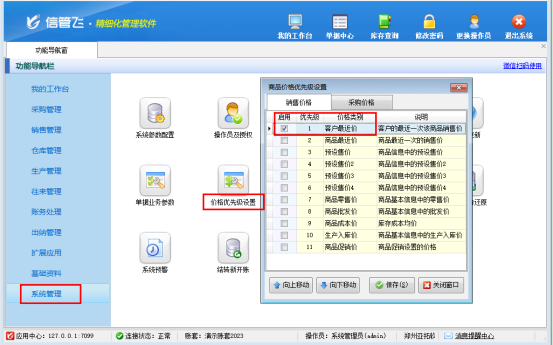 首先,設置價格優先級,功能導航窗點擊系統管理,打開價格優先級界面,勾選啟用“客戶最近價”并向上移動到第一位,保存商品價格優先級設置,如下圖所示: