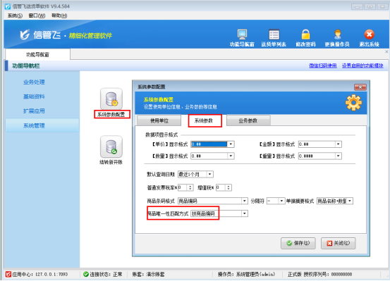 首先設置商品唯一性匹配方式,在功能導航窗點擊“系統管理”—“系統參數配置”,選擇系統參數打開,商品唯一性匹配方式中選擇“商品編碼”,保存參數配置,如下圖所示: