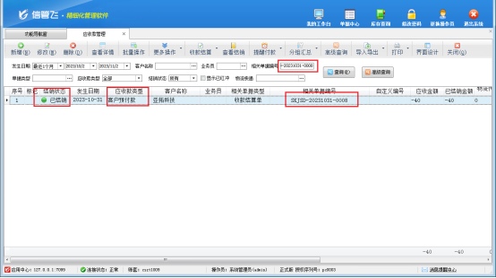 然后,選中此已結銷的客戶預付款記錄,在工具欄點擊“查看結銷”—》“查看結算單”,打開此客戶預付款的結銷記錄,更多操作下將此客戶預付款結銷記錄先紅沖后刪除,此時單據編號為“SKJSD-20231031-0008”的收款結算單即可反審修改成功,如下圖所示。
