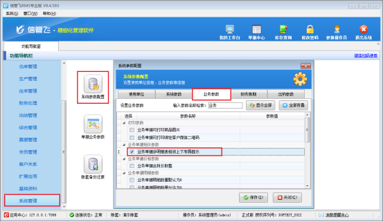 在功能導(dǎo)航窗點(diǎn)擊系統(tǒng)管理---系統(tǒng)參數(shù)配置,業(yè)務(wù)參數(shù)下--業(yè)務(wù)單據(jù)相關(guān)參數(shù)下勾選“業(yè)務(wù)單據(jù)多明細(xì)表格按上下布局顯示”,如圖所示: