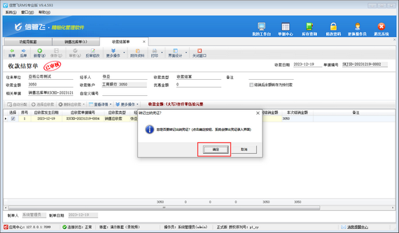 選擇收款結(jié)算單,然后點擊“查看結(jié)算單”按鈕打開銷售出庫單相關(guān)的收款結(jié)算單界面,在收款結(jié)算單界面工具欄點擊“更多操作”—》“轉(zhuǎn)記出納憑證”,在彈出的提示信息窗口點擊“確定”即可打開“出納憑證—新增”窗口,核對憑證信息,保存出納憑證即可,如下圖所示。