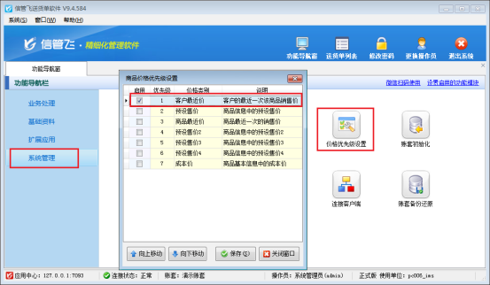 操作步驟:系統(tǒng)管理-----價(jià)格優(yōu)先級(jí)設(shè)置,把預(yù)設(shè)售價(jià)設(shè)置為第1優(yōu)先級(jí),開單選擇商品時(shí),單價(jià)獲取的是商品信息中已設(shè)置好的預(yù)設(shè)售價(jià),如圖所示: