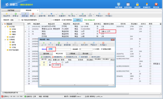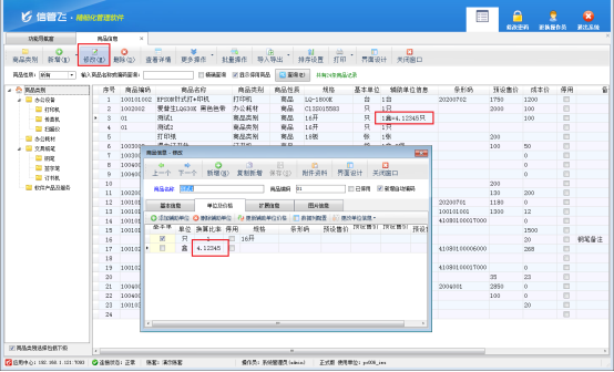 設(shè)置完成后,商品信息界面點擊修改,修改后重新進行保存,此時輔助單位信息即可保留5位小數(shù)顯示,如下圖所示。