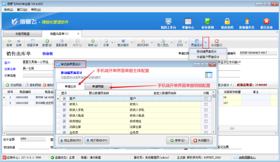 在單據(jù)界面,點(diǎn)擊界面設(shè)計(jì)旁邊小三角,點(diǎn)擊移動(dòng)端界面設(shè)計(jì),可以配置移動(dòng)端單據(jù)主體和單據(jù)明細(xì)的數(shù)據(jù)項(xiàng)顯示情況,在顯示列框里勾選顯示,如圖所示: